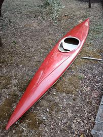 Kayak in vetroresina completa di pagaia Azzali junior: tutta l'attrezzatura è adatta a persona giovane o adulto/a di costituzione esile. Il kayak è stato usato poco e d'inverno è stato tenuto sempre al chiuso per cui si presenta ancora in ottime condizioni. Sotto la chiglia è stata aggiunta una piccola pinna direzionale, visibile in foto.