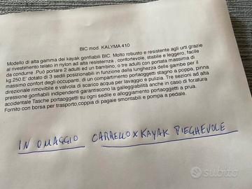 Come nuovo usato pochissime volte Raccomandato per Kayak / Kayak in mare / Kayak in acque tranquille Peso 20 kg Prodotto Kalyma 3 Costruzione dello scafo Inflatable Larghezza 95 cm Capacità 3 persone Si preferisce consegna a mano
