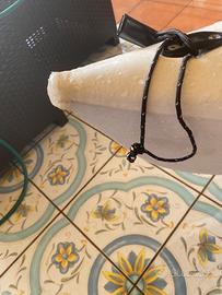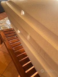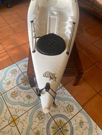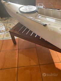 Kayak tenuto ottimamente (come da foto). Solo la punta di poppa é un po’ graffiata in superficie (durante una manovra sull’auto) ma il graffio non é profondo e viene tenuto protetto da un po’ di colla “Goop” (giusto per sicurezza), quindi è robusto e sicuro. Pesa circa 20 kg.