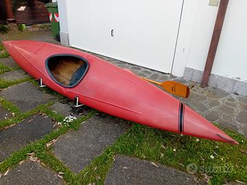 kayak in vetroresina usato completo di pagaia in legno pregiato sacchi di punta e protezione.in neoprene. con supporto in.metallo autocostruito per montaggio su barre .Ritiro a Mirandola mo
