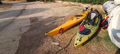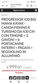 un Big Mama Progressor 4.30 giallo/nero , ottimo per turismo/pesca, timoneria a pedali, 3 gavoni, predisposizione eco, seggiolino in tessuto, 6 portacanna interni, carrellino in alluminio, pagaia e salvagente prezzo 500€, disponibile anche un Nova CARIBE 1 in pvc, m 4.50 giallo, pagaia e salvagente, qualche graffio, prezzo 180 €