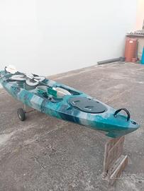 Il kayak a un posto è dotato di sedile, pagaia e carrellino fatto a mano per agevolare il trasporto.