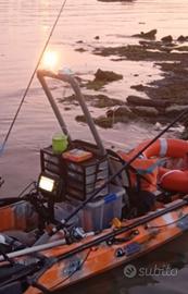 Kayak biposto, completo di motore elettrico con staffa posteriore centrale e barra di comando gestibile da tutti e due i passeggeri. Batteria 100ah litio, ecoscandaglio Garmin vivid 5, stabilizzatori, e ancora con riavvolgimento a manovella con scorrimento da prua a poppa.