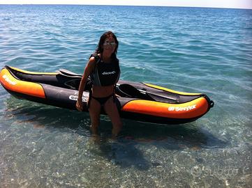 Usato solo un paio di volte e ben custodito. Il Sevylor Sirocco combina manovrabilità, stabilità, comfort e facilità di gonfiaggio. La forma ampia e il sedile rivestito garantiscono comfort e sicurezza. Caratteristiche: - Capacità (persone): 2 adulti - Peso totale massimo consentito (kg): 200 kg - Numero di camere gonfiabili: 3 - Dimensioni gonfiate: 331 x 88 cm - Peso (kg): 14 kg - Forma ampia con eccellente stabilità - Valvole Boston, Mini Boston e Mini Double Lock per un facile gonfiaggio e sgonfiaggio - Indicatore di gonfiaggio per il controllo della pressione durante il gonfiaggio - Sistema di drenaggio altamente efficiente - 2 sedili reclinabili rivestiti in tessuto con schienale alto - Sedili rimovibili: per convertire il kayak in una versione per 2 o 1 persona - Pinna rimovibile e bretelle direzionali saldate per un'eccellente manovrabilità - 4 maniglie ergonomiche per un facile trasporto - Borsa per il trasporto, manometro per il gonfiaggio facile e pinna rimovibile - 3 gilet di salvataggio - 2 pagaie