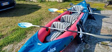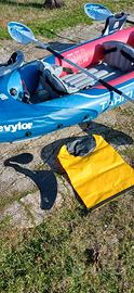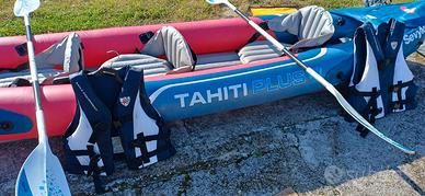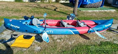KAYAK SEVYLOR TAHITI PLUS In PVC termoplastico, per uso tre persone seggiolini amovibili. Possibilità di uso con due o tre seggiolini. Dimensioni: 361 x 90 cm. Pinnetta deriva comprata separatamente per direzionare il Kayak. Pagaie doppie in alluminio con innesto centrale per il trasporto. Borsa a tracolla, colore Gialla con chiusura Impermeabile, porta cellulari e documenti. N°2 Giubbotti salvagente professionali con tripla chiusura al petto. Taglia 1 M - 1 L. Kayak con supporto tracolla per trasporto in spiaggia. Pompa per gonfiare inclusa.