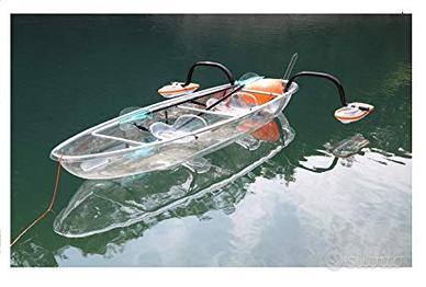 Kayak trasparente in policarbonato (lo stesso materiale degli scudi antisommossa), completo di stabilizzatori, giubbottini e pagaie. Sedili anch'essi in policarbonato.