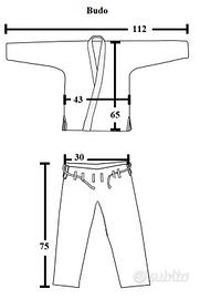 -della Budo tg. I/II, casacca cm 112 dai polsi, dalla spalla cm 65, il tronco cm 43 + pantalone cm 75 la gamba, cm 30 i fianchi E.20,00
