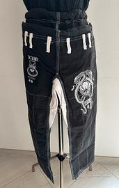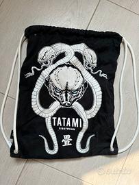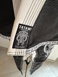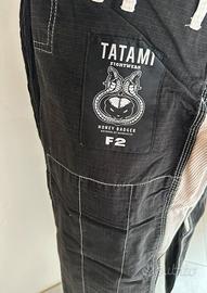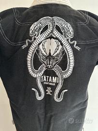 Kimono Jiu Jitsu professionale Tatami Fightwear Honey Badger F2, modello iconico co-designed da Meerkatsu. Completo di: • Giacca nera con ricami sul retro (honey badger + cobra attorcigliati), patch sulle maniche e logo Tatami; • Pantaloni leggeri con cordino, rinforzi e ricami laterali + patch F2 “Honey Badger”; • Borsa drawstring coordinata con lo stesso disegno; Dettagli tecnici: • 100% cotone; • Tessuto leggero e resistente, ideale per training e competizioni IBJJF; • Colore nero con dettagli bianchi contrasto, logo Tatami Fightwear ovunque (collo, orlo, patch); • Condizione eccellente / usato pochissimo (nessun strappo, usura minima, lavato accuratamente); Taglia F2 (equivalente circa A0-A1 slim, altezza 152-165 cm, 44-57 kg). Ideale per chi cerca un gi BJJ unico, di qualità premium e con design artistico.