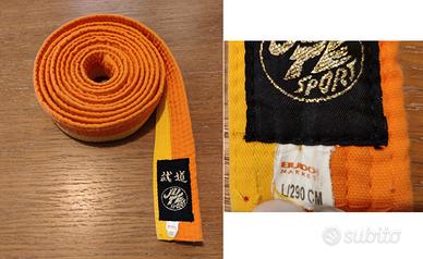 Kimono karate completo misura 3/160 adatto per bambino 8/9 anni, con cintura colore giallo/arancio L.290 Cm. poco usato ma in ottime condizioni.