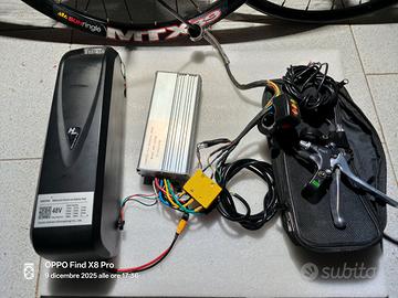 Kit motore 1000w posteriore su ruota da 27,5 pollici. Il kit è composto da ruota posteriore con il motore, ruota anteriore, centralina con acceleratore e indicatore a led, batteria 48v - 30ah. Funzionante, ma da centrare la ruota posteriore, non ha un sensore PAS, da cercare un caricatore per la batteria.
