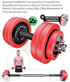 Dischi da 2.5 (nr. 10) e da 1,25 (nr. 2) tutti con protezione in gomma antiurto adatti per uso dentro casa/appartamento; nr. 2 manubri singoli e 2 ghiere per il blocco dei pesi. Tali manubri grazie all'asta di collegamento, possono essere combinati tra di loro per formare un bilanciere più lungo. Grande possibilità di allenamento per tanti esercizi muscolari.