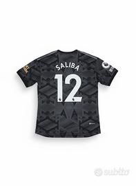 Vendo completo ufficiale Arsenal da trasferta stagione 2022/2023, composto da maglia e pantaloncini Adidas. La maglia, caratterizzata dal motivo geometrico nero con dettagli oro, porta lo sponsor Emirates Fly Better e la tecnologia traspirante HEAT.RDY. Sul retro è personalizzata con il nome “Saliba” e il numero 12, identici a quelli indossati in Premier League.