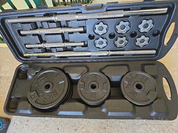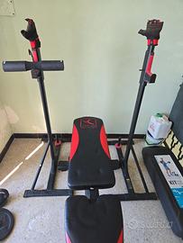 causa inutilizzo vendo: -panca domyos, - porta bilanciere - kit 50 kg pesi ancora in valigia - 20 kg pesi ulteriori - kettlebel 6 kg - gomma per bilanciere - 2x2kg manubri. vendo in blocco. trasporto a vs carico.