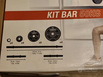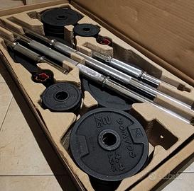 Kit x allenamento pesi. Come da foto : 2 manubri, barra per squat e tutti i dischi con relativi fermi.