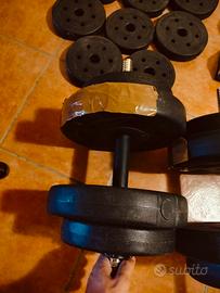 I dischi sono in sabbia (non in ghisa). Preciso che 2 dei dischi da 5 kg sono stati scotchati a causa di piccole perdite, ma sono perfettamente utilizzabili: durante l’allenamento non rilasciano sabbia grazie alla copertura sicura.