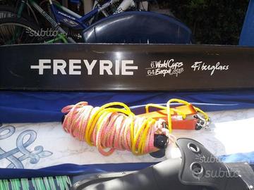 Coppia di sci nautici professionali marca Freyrie World Champions 165cm, ideali anche per imbarcazioni con motorizzazioni ridotte e sciatori robusti, usati in buone condizioni come si vede dalle foto; incluso manubrio con imbottitura aggiuntiva per una presa più confortevole e cima di traino galleggiante alta visibilità con terminale con carrucola e soppiamento per agganciarla ai due anelli posteriori della barca, inclusi anche 2 moschettoni inox uno dei quali dotato di sgancio rapido omologato ri.n.a.