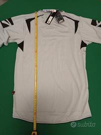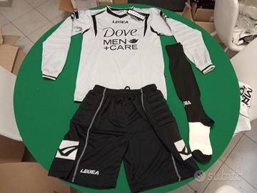 Kit calcetto/calciotto, nuovo con cartellino, composto da una divisa da portiere grigia, maglia maniche lunghe e calzoncini con rinforzi laterali, più calzettoni neri, 7 divise squadra maglia e calzoncini bianchi con inserti in nero, più 7 paia calzettoni, completano il kit 8 borsoni con doppio fondo, tasche laterali e retina. Tutte le taglie sono Large, verificate le misure in cm.