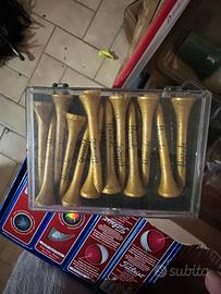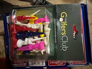 Vendo kit completo accessori da golf in ottime condizioni, ancora nella confezione originale per la maggior parte. Contenuto: • Wilson Golfer’s Accessory Pack: include divot repair tool (riparatore di buche) con manico rosso, porta-tee con 3 colori (rosso, bianco, blu) e una pallina da golf. • Porta-tee verde a forma di albero con 5 tee bianchi (molto pratico e divertente). • Set di tee dorati Harrods (marca di lusso) in scatola trasparente – 8 tee dorati con scritta Harrods. • Tee a forma di donna colorati (rosa, rosso, blu, bianco, giallo) in blister “The Golfers Club”. • Palline Titleist DT So/Lo (4 scatole nuove da 3 palline ciascuna).