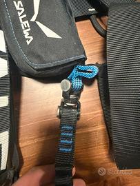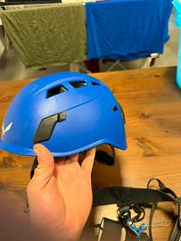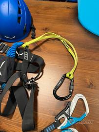 Imbrago completo Salewa per ferrate, con ganci con snodo a 360, laccio fisso con moschettone Black diamond per riposarsi in parete e caschetto L’imbrago è taglia unica veramente molto regolabile. Io sono alto 1.78 e peso 75kg. Circonferenza testa 56cm Usato per neanche 4 uscite. Perfetto