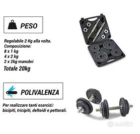 kit manubri da 20 kg perfetto per fare esercizi di allenamento con i pesi a casa. I bilancieri filettati e i dadi trattengono i pesi in modo sicuro, e il set viene fornito in una valigetta.