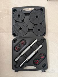 Vendo kit pesi da 20kg della Domyos, perfetto per l’allenamento a casa (bodybuilding, fitness, functional training). Il set è estremamente versatile e facile da riporre grazie alla sua valigetta rigida originale. Il kit comprende: • 2 barre in acciaio da 2 kg (diametro 28mm, lunghezza 35cm) • 4 dischi da 2 kg • 8 dischi da 1 kg • 4 bloccapiatti a molla (smart stop) per un cambio pesi rapido e sicuro • Valigetta per il trasporto Condizioni: Il set presenta un'usura media dovuta al normale utilizzo. Sono presenti alcune piccole tracce di ruggine superficiale sui dischi, tipiche della ghisa, che possono essere rimosse facilmente con una piccola pulizia o lasciate così senza che ne compromettano l'uso. Meccanicamente le barre e i blocchi sono perfetti.