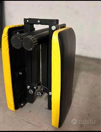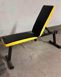 Panca totalmente richiudibile salva spazio. Schienale inclinabile. Kit manubri composto da 2 manubri,4 chiusure pesi,4 dischi da 2kg e 8 da 1kg.