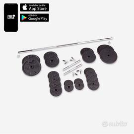 Vendo kit da bodybuilding include due manubri di 2 kg (35 cm, 28 mm), un bilanciere di 8.7 kg (175 cm), 16 dischi (4x10 kg, 4x5 kg, 8x2 kg, 4x1 kg), tre paia di bocca-dischi a farfalla.