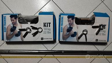 2 Kit pesi Doymos Decathlon da 10 kg ciascuno. Bilanciere Decathlon da 155 cm. Come nuovi