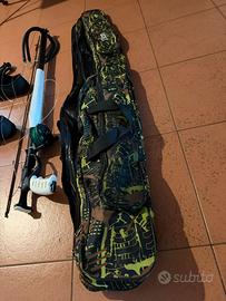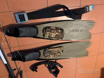 Vendo kit spearfishing/apnea completo, ideale per chi vuole iniziare o come set di scorta: come da foto include pinne Mares, fucile sub con mulinello e borsa porta-attrezzatura. Le pinne Mares (linea Avanti Quattro) sono note per la tecnologia "channel thrust" a 4 canali che aiuta a spingere più acqua con meno fatica. Calzari e pinne taglia 42-43. Fucile 75 con meccanismo acciaio inox ermes