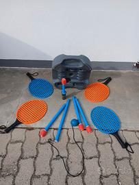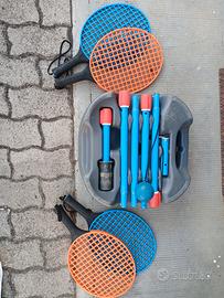 Vendo gioco Tunball di colore grigio arancio, con 4 racchette, da esterno o interno, si smonta e rimonta facilmete, la base si può riempire di sabbia o di acqua x diventare molto stabile. Si può giocare da soli o in compagni. marca Artego Decathlon.