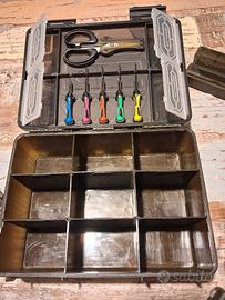 Comodissima scatola pari al nuovo comprensiva di forbice in acciaio e spilli per innesco esche dure e morbide, inoltre vendo: 1 portafinali in gomma sagomata korum 1 scatola a 4 scomparti korum 1 scatola a 6 scomparti korum 1 scatola a 12 scomparti korum Le scatole sono a chiusura magnetica e si possono riporre comodamente nella scatola