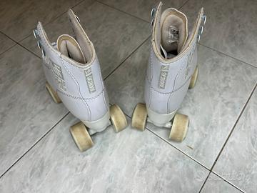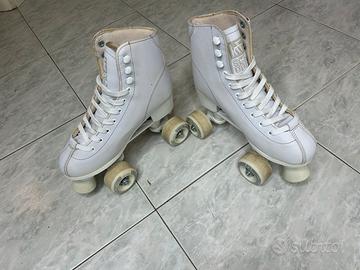 Vendo pattini a rotelle per pattinaggio artistico KRF School PPH, colore bianco, taglia 37. Pattini stile classico a 4 ruote con stivaletto alto, ideali per pattinaggio artistico, allenamento o tempo libero. Caratteristiche: stivaletto bianco con lacci ruote quad per maggiore stabilità comodi e facili da usare adatti a principianti o livello intermedio