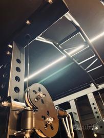Smith Machine con bilanciere, braccia di sicurezza, J-Hooks, attacco squat bulgaro, 2 maniglie cavo, triangolo tricipite, corda, corda singola, maniglie dip, cuscinetti per rematore, Lat machine.