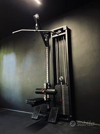 Costruzione in acciaio massiccio con profili da 3 mm, peso struttura 205 kg per stabilità, cuscinetti in alluminio per durata, 35 livelli di regolazione, accessori per ogni gruppo muscolare, colore nero opaco.