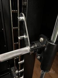 Smith Machine con bilanciere, braccia di sicurezza, J-Hooks, accessorio leg press, attacco squat bulgaro, supporto Landmine, 5 maniglie lat, 2 maniglie trazione cavo, triangolo tricipite, corda, corda singola, maniglie per immersioni.