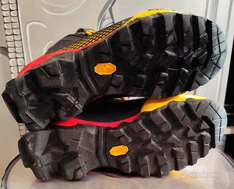 scarpone da alpinismo la sportiva aequilibrium st goretex numero 41 ,usato 3/4 volte ( qualche segno nero sulla punta gialla che si sporca facilmente ) praticamente nuovi ,suole perfette ,con scatola e cartellini .