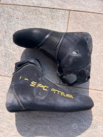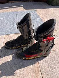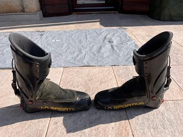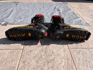 Lasportiva stratos HiCube 27, lunghezza 287 mm. Revisionati due anni fa, funzionanti. Scarpetta rovinata ma utilizzabile, eventualmente può essere sostituita con una che vada bene oppure mandandoli in Laspo