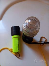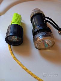 due lampade sub. Gialla Scubapro di scorta e per immersioni con poca luminosità. Nera con doppia funzione: da una parte stroboscopica per segnalazioni e per essere rintracciati, dall'altra luce per illuminare