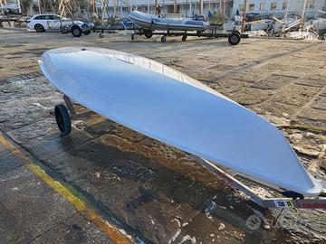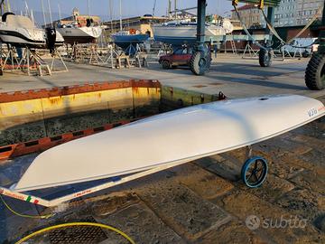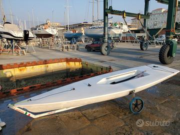 Vela e alberatura: Parte bassa in alluminio usata pochissimo (1/2 stagione nel 2023) Parte alta in carbonio usata poco 1 vela in buone condizioni per allenamento e/o regate zonali Stecche a sufficienza per la randa Scotta.