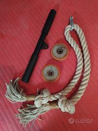 La barra è venduta insieme a 4 pulegge (2 sono di riserva) dotate di cuscinetti a sfera, un perno da carico (vedi foto), una bara corta ed una corda artigianale per i tricipiti dotata di moschettone.