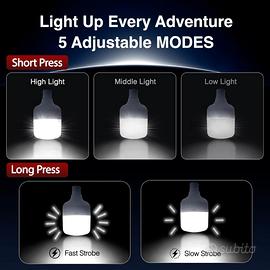 Luci LED Super Luminose:La lampada da campeggio ricaricabile con tecnologia LED avanzata, la luce prodotta non solo è intensa, ma fornisce anche una luce uniforme e naturale che valorizza qualsiasi spazio. Potenza 5000 lumens.