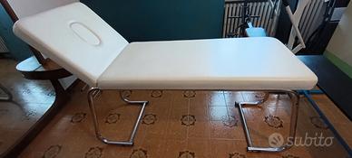 Ideale per studio medico o piccoli ambulatori. Rivestimento in finta pelle bianco panna lavabile formato da due sezioni: una parte fissa di dimensioni: 130 x 61 x h 5,5 cm. e uno schienale, che si può inclinare e fissare in più posizioni, di dimensioni: 50 x 61 x h 5,5 cm.