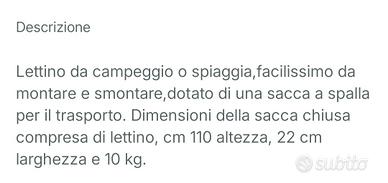 bellissimo lettino da campeggio o mare facile da richiudere con la sua sacca da portare alle spalle usato ma in ottimo stato