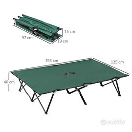 Questo letto da campeggio pieghevole è progettato per offrire una soluzione pratica e resistente per il riposo all’aperto. Realizzato in tessuto Oxford in poliestere con struttura in metallo verniciato, misura 193 x 125 x 40 cm, risultando adatto a due persone. Il sistema pieghevole consente un rapido montaggio e smontaggio, ed è dotato di una comoda sacca per il trasporto. Ideale per campeggi, escursioni o situazioni d’emergenza, unisce compattezza, solidità e comfort in un unico prodotto facilmente trasportabile. Il prodotto viene spedito direttamente dal produttore, entro 7 giorni lavorativi. I tempi di spedizione possono variare in funzione di molteplici fattori, solitamente in 15 giorni tutti i prodotti vengono consegnati dal corriere.