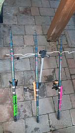 Lotto composto da 3 canne m.3,00+3 mulinelli tutti perfettamente funzionanti (2 tubertini con evidenti segni di salsedine ed un browning come nuovo)+tripode+ fodero shimano con pancia per il contenimento di tutto.