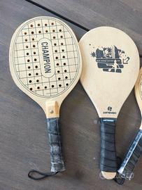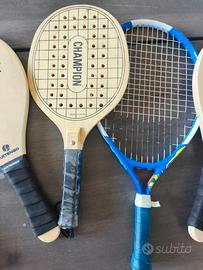 Vendo lotto completo di 5 racchette per inutilizzo, tutte in ottime condizioni e pronte all'uso: 1 Racchetta da Tennis Artengo (Modello adulto, blu/gialla, corde perfette). 2 Racchettoni da spiaggia Artengo (Legno, con impugnatura comfort). 2 Racchettoni da spiaggia Champion (Modello classico in legno, molto resistenti).