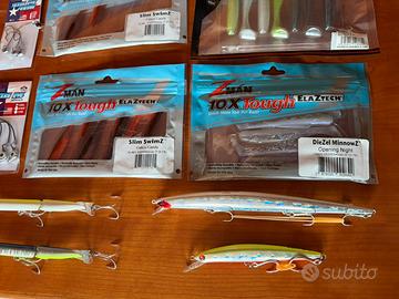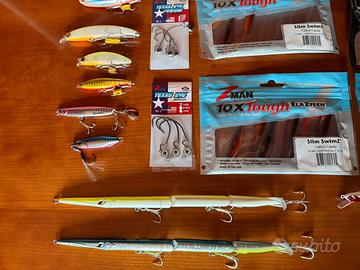 Lotto di altissima qualità per lo spinning dal medio leggero al medio pesante: 80 in zona o 87 spedito con BRT (non uso tuttosubito). Non scambio, non tratto e non separo, vendo solo in blocco -Duo tide minnow slim 200 -Apia Dover 70F Shallow runner -Apia Dover 99F -Seaspin Pro Q 90 Flat -Seaspin janas 70 -seaspin mommotti 115ss -Major craft Jigpara surf 40g. -Duo drag metal cast 30 g. -2x Hunthouse (replica stylo jointed 255) -1 pacco nuovo di gomme z man da 3” slim swim Z + 2 extra -1 pacco nuovo di gomme z man da 4” diezel minnow Z -4 testine z man texas eye finesse apposite per quelle da 3” -3 testine z man texas eye apposite per quelle da 4” -7 gomme Jackall rhytm wave da 3,8” in colori assortiti