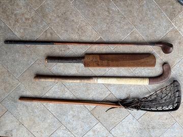 Vendo splendido lotto di attrezzi sportivi vintage, ideali per collezionisti, arredamento a tema sportivo o appassionati di sport storici. Tutti i pezzi sono originali, in legno massello, con segni del tempo che ne testimoniano l’autenticità e l’utilizzo sportivo del passato. Il lotto include: Mazza da golf in legno (probabile inizio '900) – Con testa curva e struttura in legno pregiato. Bellissima patina d’epoca. Mazza da cricket vintage – Marca “Harwood”, modello “DRIVER”, perfetta per collezionisti o appassionati del cricket tradizionale. Mazza da hockey su prato in legno – Impugnatura avvolta e curvatura classica, usata ma in buone condizioni strutturali. Bastone da lacrosse antico con rete in cuoio – Rarissimo da trovare, con rete originale intrecciata a mano. Ottimo per collezioni sportive storiche. Condizione: Buone condizioni generali per l’età degli oggetti. Presenti segni d’usura compatibili con l’utilizzo e l’epoca. Perfetti per: Collezionismo, arredo vintage, vetrine sportive, scenografie, bar/pub a tema, musei sportivi