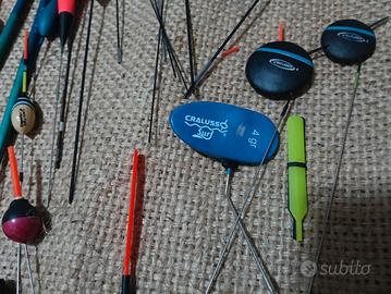 vendo un lotto di oltre 50 galleggianti, circa 20 sono da pesca all'inglese marca middy, drennan in negozio vengono circa 5 euro al pezzo, gli altri sono modelli per la pesca a bolognese da 0.20 grammi fino a 5 grammi, materiale usato alcuni sono nuovi.
