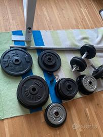 Vendo lotto panca da palestra con 2 manubri e chiusure, bilanciere corto con apposite pinze e 75kg di dischi. Alcuni dischi sono gommati. La panca é dotata anche per un attrezzo per le gambe. Ottime condizioni
